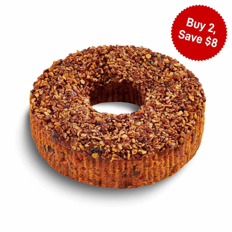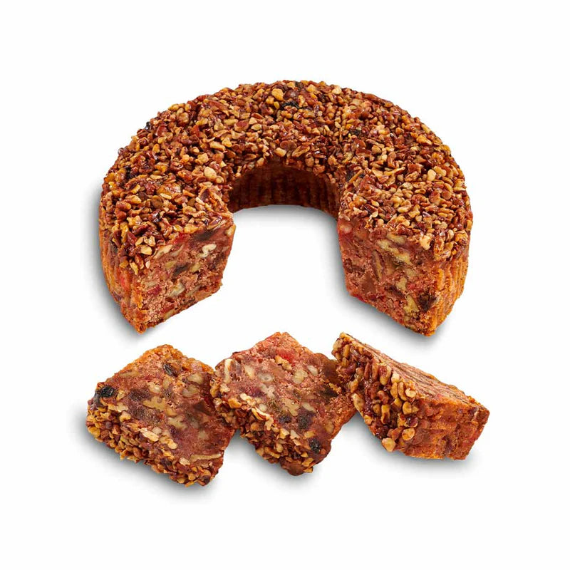 This golden brown masterpiece is made with thoughtfully sourced ingredients and baked to perfection, boasting rich, fruity flavors that melt in your mouth. Each slice is filled with hand-picked pineapples and juicy cherries and topped with a generous sprinkling of finely chopped pecans, adding a satisfying crunch and nutty sweetness to every bite.